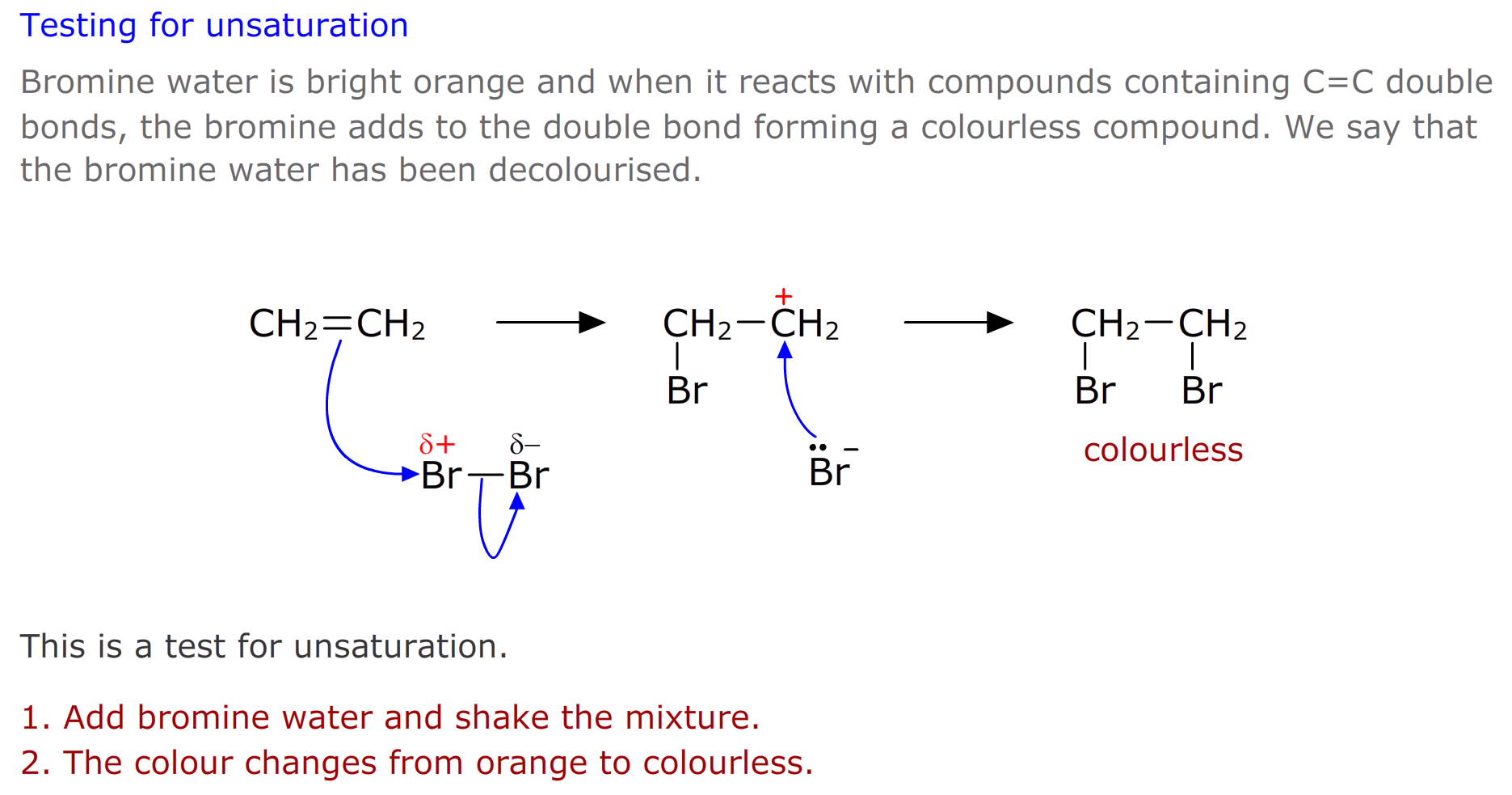 To a second clean test tube with bromine water, add a few drops of hexane. Place a bung in the test tube and shake. Observe any change